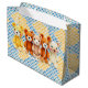 Cute baby shower or new baby gift bags with crocheted stuffed animal teddy bears in blue, brown and yellow.