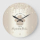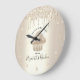Gör ett stilfullt intryck med denna eleganta, sofistikerade, enkla och moderna anpassade namnväggsklocka. En gnistrande, champagnegyllene cupcake, handskriven scripttypografi och glitterdroppar överlagrar en falsk metallisk champagnegyllene ombre-bakgrund. Anpassa med ditt fullständiga namn, företag eller annan information. Du kan välja en rund eller fyrkantig urtavla. Gör ett chic, professionellt och fashionabelt uttalande i ditt kök eller på din arbetsplats.