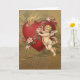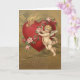 Den här Alla hjärtans dags-kortet visar en cupid i vintage-stil med mjuka gyllene lockar och breda, milda ögon som svävar framför en stor, djupröd hjärta. Hans små vingar är utbredda som om han svävar, och en gyllene pil går genom hjärtat. Nära pilen stiger ljusa, gnistrande lågor upp och fångar ljuset, vilket ger mitten en varm glöd. Cupiden håller en knippe rosor i ljust rosa och mörkrött, med stjälkar och blommor vilande över hjärtat. Bakom allt är en rik gyllene bakgrund med svaga, gammaldags mönster som får scenen att kännas klassisk och romantisk. Längst ner visas orden "Till min Alla hjärtans dag" i blanka, gyllene kursivbokstäver