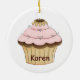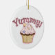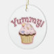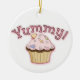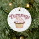 Färgfull julprydnad, med viskartad grafik av söt muffinsar, på framsidan och baksidan, med rosa grafisk text, på framsidan och läs Yummy. Anpassa den bruna texten, på baksidan, för att säga vad du vill. Underbar för alla som kärlek godis.