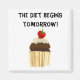En vit fyrkantig kylmagnet med en utsökt chokladkaka, täckt med grädde och jordgubbsbär, tillverkad av en handmålad papper kollagedesign av Judy Adamson. Ovanför cupkakan är ord: "Dieten börjar i morgon!" En kylmagnet som testar utlösning av valfri dieter! Chokladkakan finns också på ett hälsningskort och på en dam-spaghetti-bandets T-shirt.