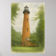 This captivating watercolor portrays the majestic Currituck Beach Lighthouse, a beacon of history and enduring strength on the Outer Banks. Its distinctive unpainted brick facade, a rich reddish-brown, stands proudly against a soft, overcast sky. Lush green foliage frames the towering structure, with the vibrant leaves of surrounding trees providing a verdant embrace, and a meticulously manicured lawn stretching invitingly in the foreground. The warm tones of the brick contrast beautifully with the cool greens, highlighting the natural beauty and timeless presence of this historic landmark. This piece captures the serene dignity and rustic charm of one of North Carolina's beloved lighthouses.