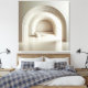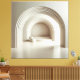 Eine warme, minimalistische Nische mit weichen Rundungen, geschichteten Bögen und einer gepolsterten Sitzfläche. Natürliches Licht betont die sanfte Geometrie und schafft eine einladende, moderne Atmosphäre.