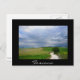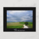Vykort om en slingrande "strada bianca"-smuts med många kurvor genom grönten fält i ett landskap i Toskana med träd längs väg och vackra moln i himmel som leder till ett mål i avstånd med ett svart gräns och texten: "Toscana".