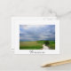 Vykort om en slingrande "strada bianca"-smuts med många kurvor genom grönten fält i ett landskap i Toskana med träd längs väg och vackra moln i himmel som leder till ett mål i avstånd med ett vitt gräns och texten: "Toscana".