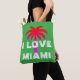 Modern graphic artwork featuring vibrant green background with palm tree in gradient pink. Big cool elegant text in white I love Miami.