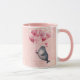 Happy Valentine's Day romantic mug with a personalized message and a cute seal illustration with heart balloons. Pink background design.