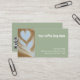 Add your custom text to this business card template. All of the modern stylish script is editable. On the front is a photo of coffee latte art in a heart shape. If you prefer you can replace this photo with your own photograph. This trendy sage green or eucalyptus green and white card would be great for a coffee shop. Add the name of your cafe or coffee house. On the back you can add custom text and a QR code with more custom text.