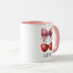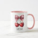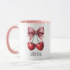 Add a sweet and stylish touch to your daily routine with this adorable personalized cherry and pink bow mug! Featuring a charming watercolor-style illustration of two ripe red cherries tied with a lovely pink ribbon, this design is both whimsical and chic. The mug's interior and handle boast a matching soft pink color, making it an extra pretty addition to your kitchenware.