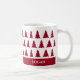 Customizable holiday mug features a bold maroon tree pattern on a white background above a dark red stripe on the bottom with your name in white on each side. Easily add your name or text in the sidebar. Other style mugs also available in the sidebar.