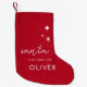 Make Christmas morning extra special with this personalized red Christmas stocking featuring a charming “Santa Stop Here For” design. Simple yet festive, this stocking adds a classic holiday touch to your mantel, fireplace, or family room. Customize it with any name to create a one-of-a-kind keepsake for kids, teens, or adults. The bold red background and modern white typography make it a timeless Christmas favorite for years to come.