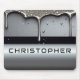 Polished chrome nameplate reading NAME with dripping liquid metal and strong reflective highlights. Embossed 3D typography on a sleek dark background evokes luxury, modern branding, industrial design and custom identity.