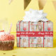 Customize your own red birthday wrapping paper with a cute 5 photo collage. Add the person's name and year in white script above the five photographs for bright, bold personalized gifts.