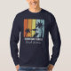 Personalized navy blue beach long sleeve t-shirts for your family trip to Hawaii, Florida, or other tropical island destinations. Cool palm trees sway against retro colors of orange and yellow above your customized vacation name in white script. Matching tees are great for a group going on a cruise or coastal getaway.