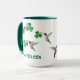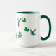 Cute mug with hand-painted ruby-throated hummingbirds carrying shamrocks. Just add your name!