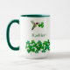Cute custom St. Patrick's Day mug featuring a hand-painted ruby-throated hummingbird carrying a shamrock.