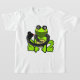 A bright green frog and a friendly snake sharing a hug. A cute and funny illustration of an unlikely friendship between predator and prey.
