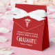 This modern personalized red medical school graduation party favor box features the college graduate name in elegant white script for the class of 2026. Customize with your university under the medical caduceus for great graduation gifts.