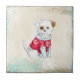En söt domestic-valp med en röd och vit, ädel julsvett på honom. Ett brunt öga och brunt öra på den här keramiska fotoplattan.