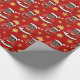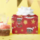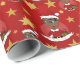 En julomslutning papper med en illustration av en söt, leende afrikansk pojke med kort svart hår och glasögon, pojken bär en Jultomten-dräkt med röd hatt och håller kvar en present. I en röd cirkel på en röd bakgrund med stjärnor, en juldesign med en redigerbar textmall för ditt namn eller meddelande