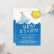Roligt Nautical Ahoy, det är en pojkbabyduschinbjudan med en mild ansikte sol med en blå segelbåt med ankare med modern handskriven typografi