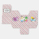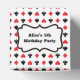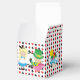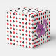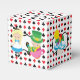 Cute Alice i Wonderland temaparty favör box för ett barns födelsedag. Den lilla flickan Alice i sin blå klänning och Mad Hatter sitter ovanpå ett kortdäck mönster i rött och svart med spader och diamantsymboler. Coola cheshire cat and caterpelare på båda sidor.