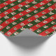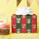 Cute-Älvor som bär jultomten sitta på juldekorationer av grönt, rött och vitt mot bakgrund av röda och grönt rand och guld.