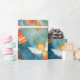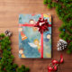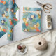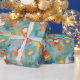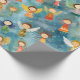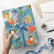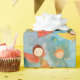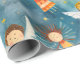 Festiv förpackning papper med mönster av söt änglar på blå bakgrund.