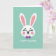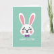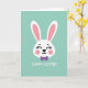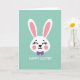 This card shows a stylized white bunny face centered on a flat mint-green background 🐰. The long upright ears have soft pink inner sections that match the rosy blush on its cheeks, giving it a tender, friendly look. Its eyes are drawn as closed curved lines with small upward lashes, as if it’s smiling at someone just out of view. A tiny black-outlined nose and a simple curved mouth keep the expression sweet and calm, like a quiet moment shared between friends. Just under the chin sits a rich purple bow tie, adding a dressy touch that feels a bit like showing up for a special date 🐇. Below the illustration, a short Easter greeting appears in white, set in a simple sans-serif style and centered near the bottom. The layout leaves plenty of open space around the character so the design feels airy and easy to take in. The bow tie is a solid purple shape with crisp edges, positioned directly beneath the smile.
