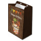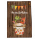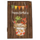 Den här presentpåsen för hösten Grattis på födelsedagen har en söt cupkaka som är dekorerad med en godispumpa, akorns och färgstarka löv. Det finns också en buntbanderoll med akorner och en faux wooden-bakgrund.