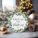 Den här söta prydnaden om "Baby Bumpens första jul" är ett bra sätt att fira det kommande baby. Den har en vattenfärgad krans med gröna och röda bär och modern kalligrafi. Anpassa med år. Utformningen är densamma på fram- och baksidan av ornament. Gör en underbar Julklapp för att du förväntar dig föräldrar!