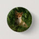 Knapp med ett foto med en söt liten baby räv med rött och vitt päls. Omringad med lush grönt löv och gräs.