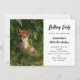 Födelsedagsfest inbjudan med ett foto med en söt liten baby räv med rött och vitt päls. Omringad med lush grönt löv och gräs.