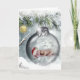 Julkortet har en söt liten baby med en julhatt inuti en bauble på träd i skogen som är täckt av snö.