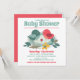 En inbjudan till en slussare för spädbarn designad med en familj av söta fåglar färgad i röda nyanser och grönt på vit bakgrund. Det motsatta är en motsvarande ljusröd . Om du vill anpassa dig ersätter du bara exempeltexten med hjälp av vår enkla mall för att slutföra all information.