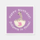 Det är party tid! Denna förtjusande chick vid lycklig kommer att tillföra någon roligt till alla party. Ritad i en söt illustration av tecknaden stil på en ljus lila- och rosa-polarbakgrund.