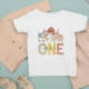 Cute barnyard 1:a födelsedag: party t-shirt med betäckande boskap, inklusive en ko, get, gris, får, åsna, häst, kanin, anka och tupp, barnets ålder och ungarna namn i ett typsnitt av eleganten.