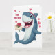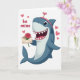 This card shows a cute cartoon shark in ocean blues and soft white, set against a plain white background. The shark has big, shiny eyes and a wide, friendly smile with small, harmless-looking teeth. It wears a pink headband with a heart-shaped bow, which adds a sweet Valentine’s touch ❤️. One fin is stretched out as it offers a red rose tucked into a cream-colored envelope. A few small pink hearts float around the shark, helping the whole scene feel romantic and kind 💘. To the left, the words “be mine” appear in red letters that look thick and rounded, standing out clearly on the white space. Overall, it’s a funny, gentle take on love, turning a tough sea creature into a caring messenger