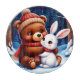 Illustration av en glad nalle som kuddar en kniv under en snövinter-natt, omgiven av festliga helgdag och en färgstark leksak tåg.