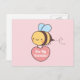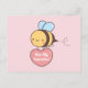 Ett vykort i hälsning med ett sött, litet flygande bi håller på ett hjärta med pun ord "Bee My Valentine!" Perfekt för Alla hjärtans dag för din krock!