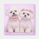 This sweet illustration features an adorable Bichon Frise couple sitting side by side against a soft blush pink background. With their signature fluffy white coats, round expressive eyes, and gentle smiles, this artwork beautifully captures the cheerful and affectionate nature of the Bichon Frise breed. Coordinating floral accessories—a floral bow tie for him and a matching floral crown for her—add a romantic Valentine touch while keeping the design elegant and timeless.