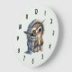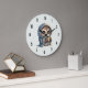 En klocka med en kawaii illustration av en storögd uggla i en vinterrobe och en sjalv som håller en hett kaffe.