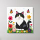 Cute Black and White Cat, Flowers and Butterflies Canvastryck