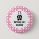 Knappen för födelsedagsflicka med en svart illustration av en balettdansare tofflor och hennes ben. Ballerina står på sina tår, en pointe. Bakgrunden är en mönster som består av vit polka dots på rosan.