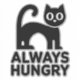 Stiliserad svart katt med stort ögon och ett lekfullt uttryck. Kattens kropp är designad i en enkel, modern form och betonar dess trovliga svan och runda form. Under katten visas frasen "ALWAYS HUNGRIG" i fet brev, även i svart. Den övergripande utformningen är minimalistisk, med ett monokromt färg-system som ökar öga-fångstmöjligheterna. Kombinationen av katten och texten skapar ett humoristiskt och charmerande tema som kan vara tilltalande för kattälskare.