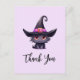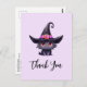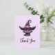 Tack för vykortet med en roligt Halloween-temaillustration för kattälskare. En svart katt med stor svart katt som bär en stor svart häxhatt med en purpur rosa bälte runt bommen.