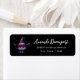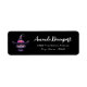 Adressetiketter med en roligt Halloween-temaillustration för kattälskare. En svart katt med stor svart katt som bär en stor svart häxhatt med en purpur rosa bälte runt bommen.