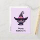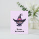 Halloween-vykort med roligt Halloween-temaillustration för kattälskare. En svart katt med stor svart katt som bär en stor svart häxhatt med en purpur rosa bälte runt bommen.