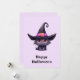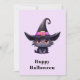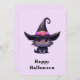 Ett platt Happy halloween-kort med roligten Halloween-temaillustration för kattälskare. En svart katt med stor svart katt som bär en stor svart häxhatt med en purpur rosa bälte runt bommen.
