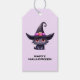 Gift-märkre med roligten Halloween-temaillustration för kattälskare. En svart katt med stor svart katt som bär en stor svart häxhatt med en purpur rosa bälte runt bommen.